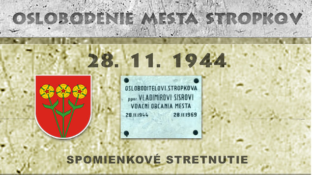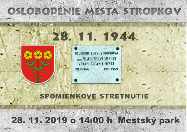 Mesto Stropkov, Okresný úrad v Stropkove a Slovenský zväz protifašistických bojovníkov - Základná organizácia v Stropkove, Vás pozývajú na SPOMIENKOVÉ STRETNUTIE, ktoré sa uskutoční 28.11.2019 o 14:00 h pri príležitosti 75. výročia oslobodenia mesta Stropkov.